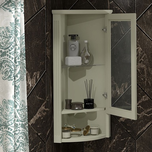 Описание: подвесной угловой шкаф для ванной с открытой нишей и застекленным распашным фасадом (петли справа). Внутреннее пространство оборудовано полкой из прозрачного стекла.