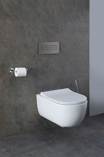 - Сам унитаз занимает небольшое пространство у стены вместе с лаконичной кнопкой для пуска воды.