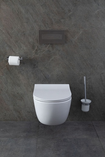 - Сам унитаз занимает небольшое пространство у стены вместе с лаконичной кнопкой для пуска воды.