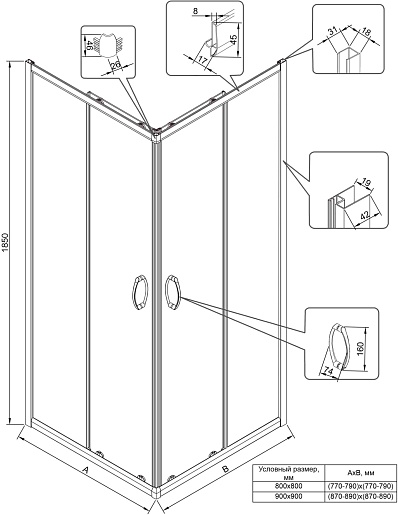 - Толщина стекла: неподвижное - 4 мм, дверь - 5 мм.