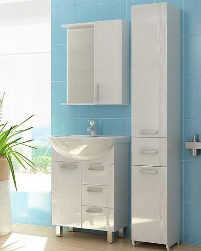 Комплектация: зеркальное полотно с нижней полкой и козырьком. Справа расположен глянцевый распашной шкаф с механизмом плавного закрывания, вкладными полками и хромированной ручкой.