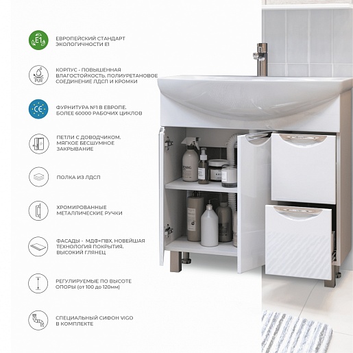 Комплектация: тумба под раковину, сифон, ножки (4 шт.).