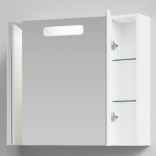 - Зеркальный шкаф Мальта 90 белый: влагостойкое зеркало, галогенная подсветка, розетка и выключатель.