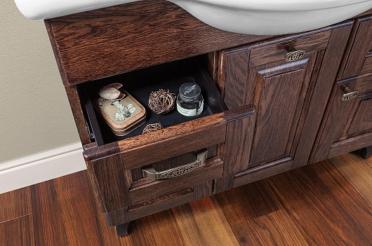 - Тумба под раковину Дубини 95: корпус и фасад изготовлены из массива дуба. Современные механизмы ящиков и петель Blum Legrabox (Австрия) оснащены доводчиками, дно ящиков декорировано бархатом.
