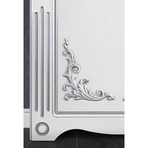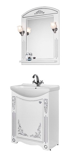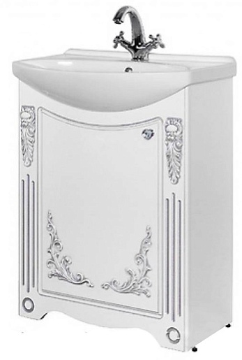 - Тумба с раковиной Кармен 65: раковина Стиль 65, тумба под раковину (патина, серебро) с распашной дверью, декор из дерева с серебряной патиной, фурнитура BLUM.