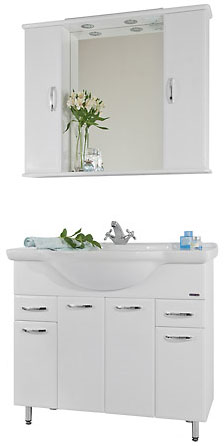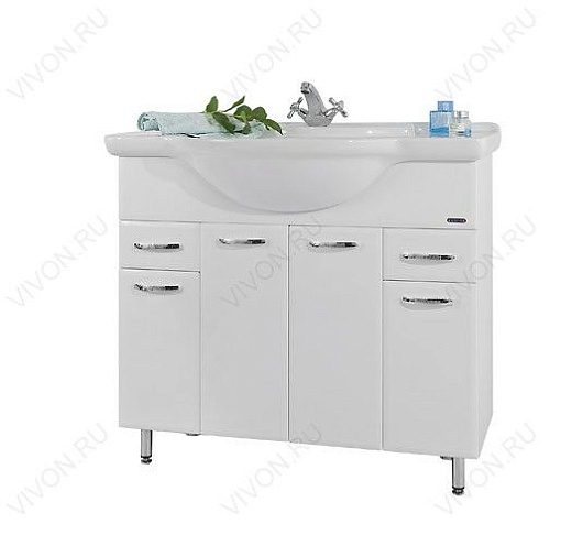 Комплектация: Тумба с раковиной "Дрея 95", два выдвижных ящика, распашные фасады, регулируемые по высоте ножки, фурнитура хром.