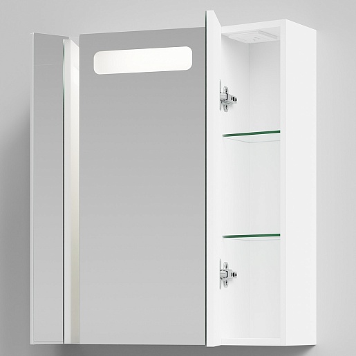 - Зеркальный шкаф Мальта 70: влагостойкое зеркало, галогенная подсветка, розетка и выключатель.