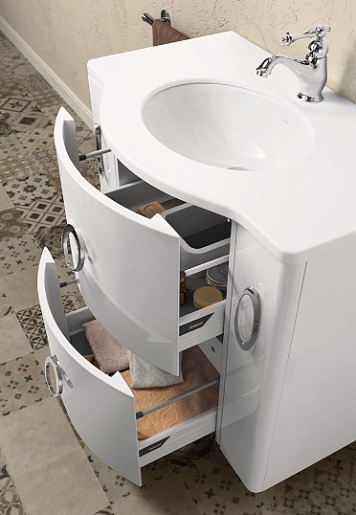 - Тумба под раковину Милана 85: корпус и фасад изготовлены из МДФ Kronospan, покрыты высококачественной эмалью SAYERLACK (Италия) по итальянской технологии. Современные механизмы ящиков Blum Legrabox (Австрия) оснащены доводчиками, дно ящиков декорировано бархатом.