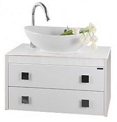 Комплектация: Подвесная тумба со столешницей из акрилового камня с двумя выдвижными ящиками, настольная фаянсовая раковина "Гамма 560", фасад с контрастной отделкой. Тумбы и подвесные шкафы приобретаются отдельно.