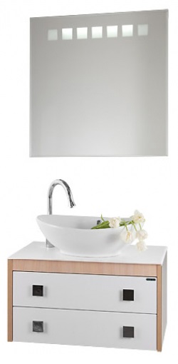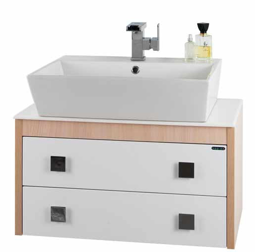 Комплектация: Подвесная тумба со столешницей S-40 с двумя выдвижными ящиками, настольная фаянсовая раковина "Гамма 560", фасад с контрастной отделкой.