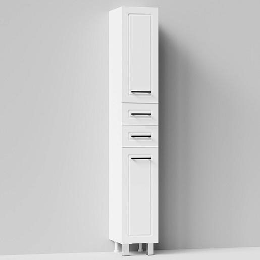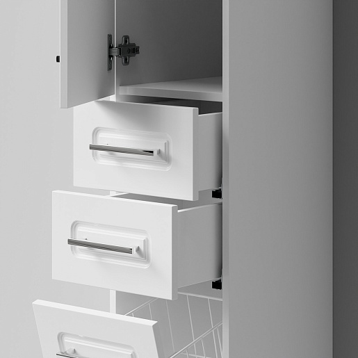 Комплектация: напольный пенал с двумя распашными дверцами и двумя выдвижными ящиками в центре. Корзина для белья. Ориентация дверей — левая.