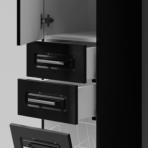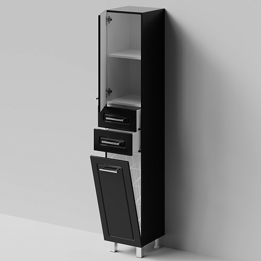 Комплектация: напольный пенал с двумя распашными дверцами и двумя выдвижными ящиками в центре. Корзина для белья. Ориентация дверей — левая.