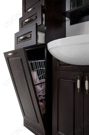 Комплектация: наверху секция с распашной дверцей (ориентация — левая), в центре два выдвижных ящика, внизу откидное отделение с бельевой корзиной.