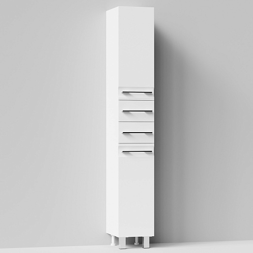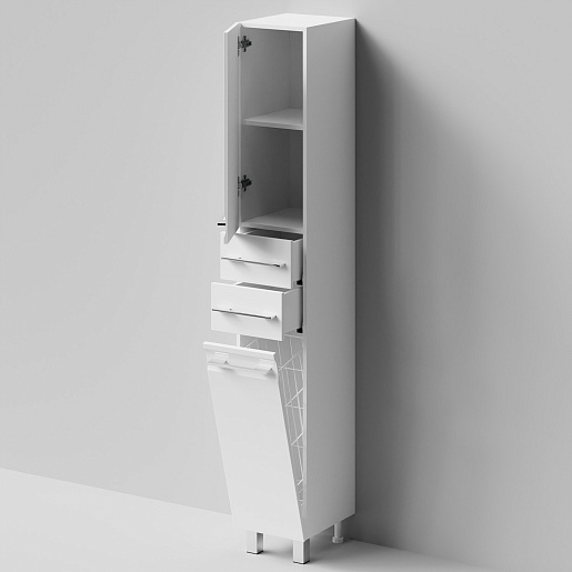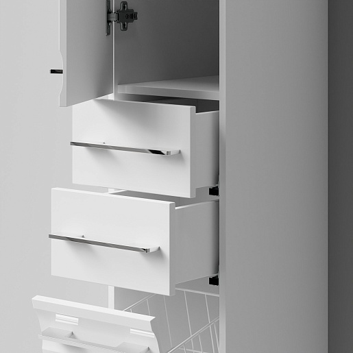 Комплектация: напольный пенал с распашной дверцей, двумя выдвижными ящиками в центре и откидным фасадом с бельевой корзиной. Ориентация дверей — левая.
