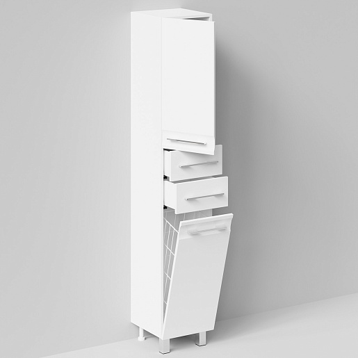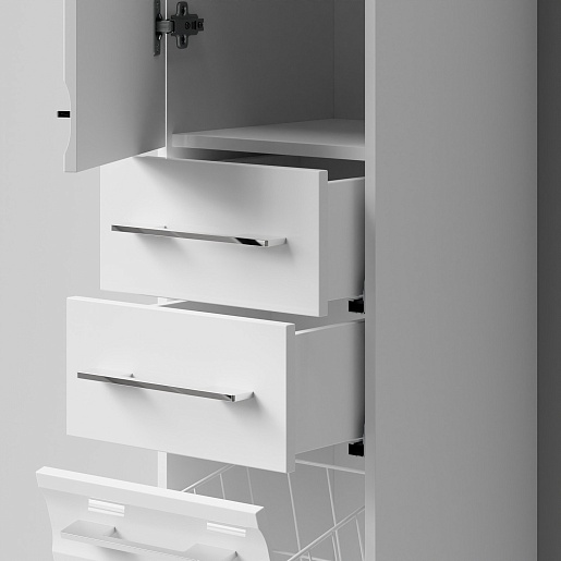 Комплектация: напольный пенал с распашной дверцей, двумя выдвижными ящиками в центре и откидным фасадом с бельевой корзиной. Ориентация дверей — левая.