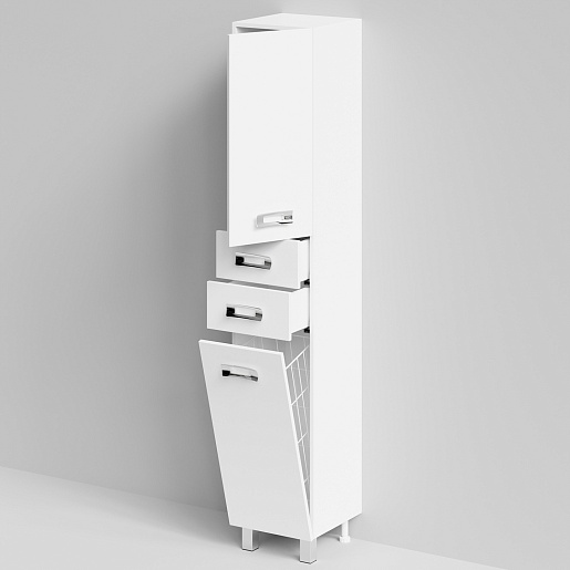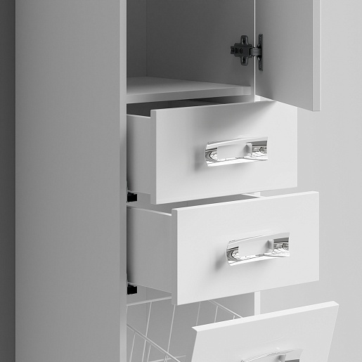 Комплектация: напольный пенал с двумя распашными дверцами и двумя выдвижными ящиками в центре. Бельевая корзина. Ориентация дверей — правая.