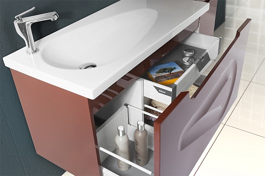 Описание: один ящик. Тумба с умывальником TS-60101 100 см. Корпус и фасад окрашенный МДФ (5 слоев, покраска SAYERLACK Италия), петли с доводчиками на дверцах, ящики оборудованы направляющими скрытого монтажа с доводчиками фирмы Blum (Австрия).