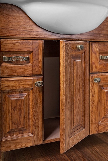 - Тумба под раковину Дубини 85: корпус и фасад изготовлены из массива дуба. Современные механизмы ящиков и петель Blum Legrabox (Австрия) оснащены доводчиками, дно ящиков декорировано бархатом.