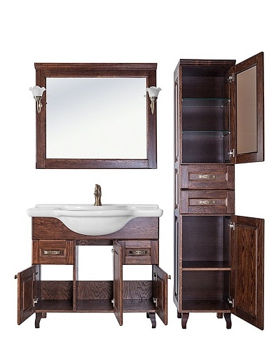 - Тумба под раковину Дубини 85: корпус и фасад изготовлены из массива дуба. Современные механизмы ящиков и петель Blum Legrabox (Австрия) оснащены доводчиками, дно ящиков декорировано бархатом.