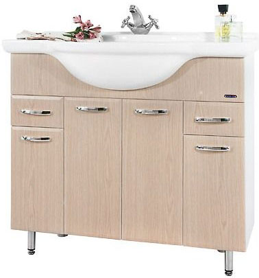 Комплектация: Тумба с раковиной "Дрея 95", два выдвижных ящика, распашные фасады, регулируемые по высоте ножки, фурнитура хром.