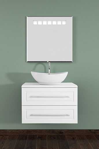 - Тумба с раковиной Либретто 80: раковина Гамма 56 см, тумба со столешницей (композитный материал) под накладную раковину, ручки из металла, петли и ящики с доводчиками.