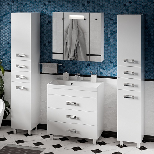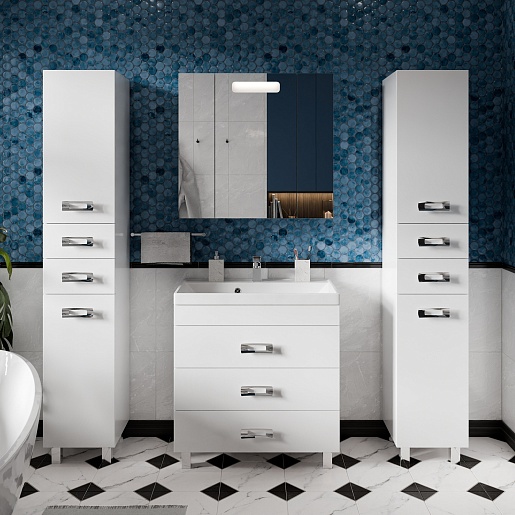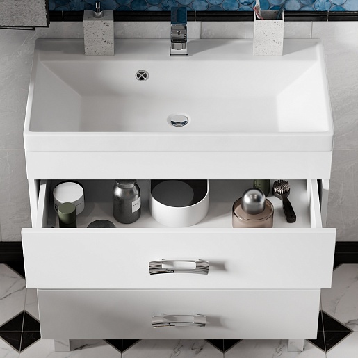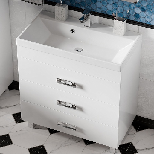 - Тумба с раковиной Орландо 80: умывальник Classic 80 (литьевой мрамор), тумба под раковину, ручки и ножки из металла, петли и ящики с доводчиками.