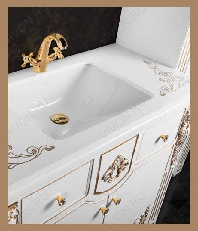 - Тумба с раковиной Версаль 120: врезная раковина Melana MLN-540N, столешница из искусственного камня с патиной, тумба под раковину (патина, золото) с двумя распашными дверцами, тремя ящиками, ручки и ножки из металла, петли и ящики с доводчиками BLUM.