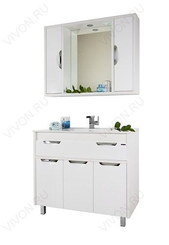 Комплектация: влагостойкая зеркальная панель с открытой полочкой, два боковых шкафчик с распашными дверцами, галогеновый светильник, розетка для фена или бритвы.