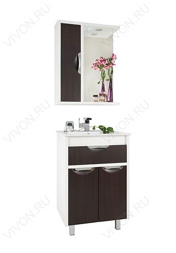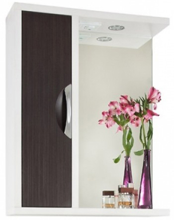 Комплектация: влагостойкая зеркальная панель с полочкой, шкафчик с распашной дверцей, подсветка с автономным выключателем, розетка для фена или бритвы. Фасад венге, корпус белый.