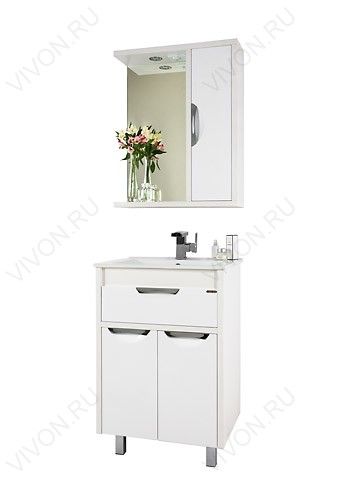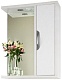 Комплектация: влагостойкая зеркальная панель с полочкой, шкафчик с распашной дверцей, подсветка с автономным выключателем, розетка для фена или бритвы.