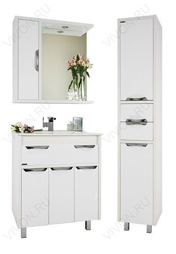 Комплектация: влагостойкая зеркальная панель с полочкой, шкафчик с распашной дверцей, подсветка с автономным выключателем, розетка для фена или бритвы.