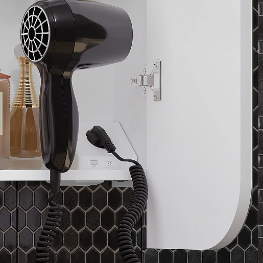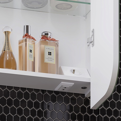 Система хранения: две распашные дверцы, стеклянные полки внутри шкафа.