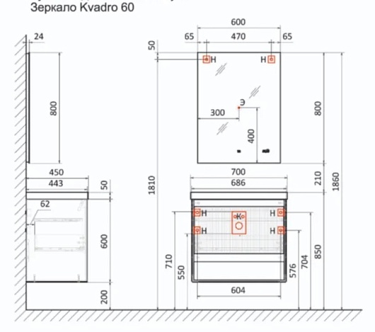 Jorno Зеркало Kvadro 60 Kvdr.02.60/W/RL